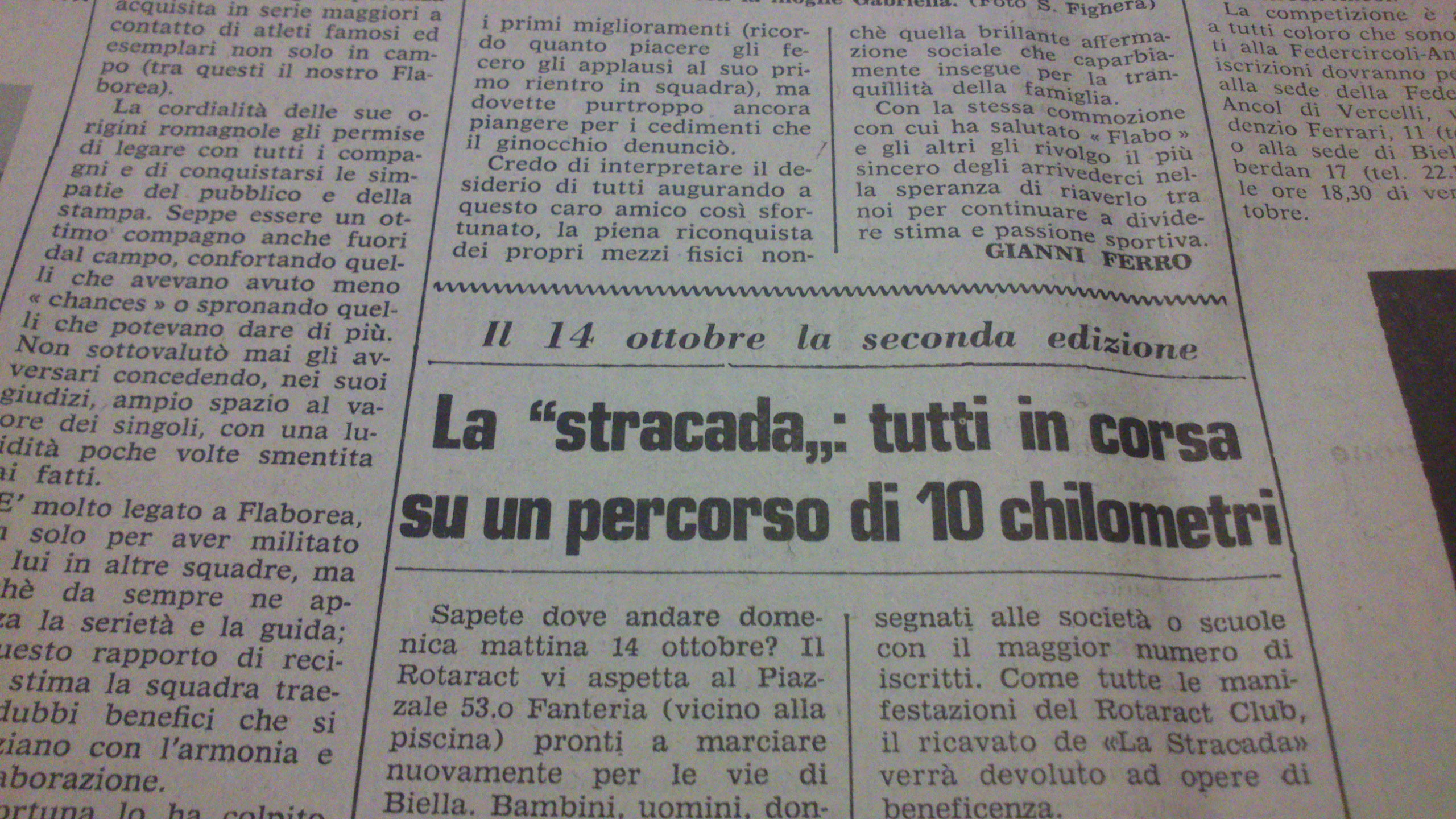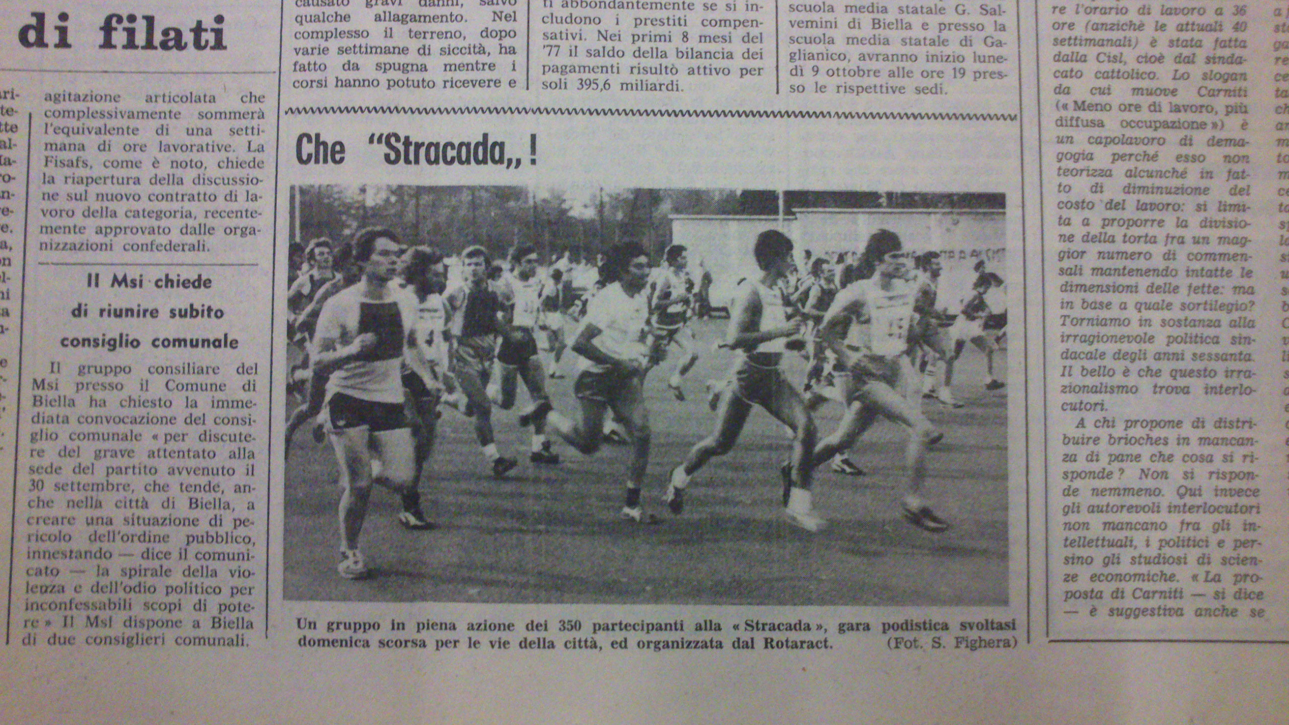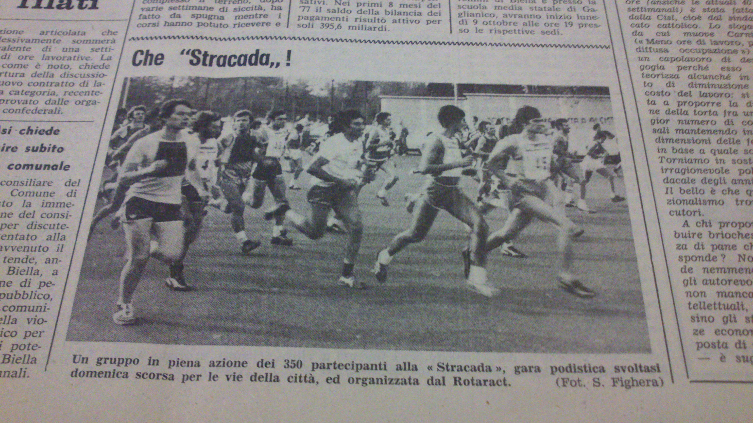 Era l'Ottobre del 1978 e sull'Eco di Biella compariva un articolo dal titolo "350 alla Stracada. Grande partecipazione all'iniziativa del Rotaract". L'articolo proseguiva con le classifiche dei veterani uomini, veterani donne, seniores uomini, seniores donne, ragazzi, ragazze e tra i vincitori una coppia di gemelli di 3 anni! Nella pagina a fianco con il titolo "Che Stracada" appariva una foto di un gruppo in piena azione durante la corsa (per le foto storiche visita la galleria) che vedeva la presenza di 350 partecipanti.