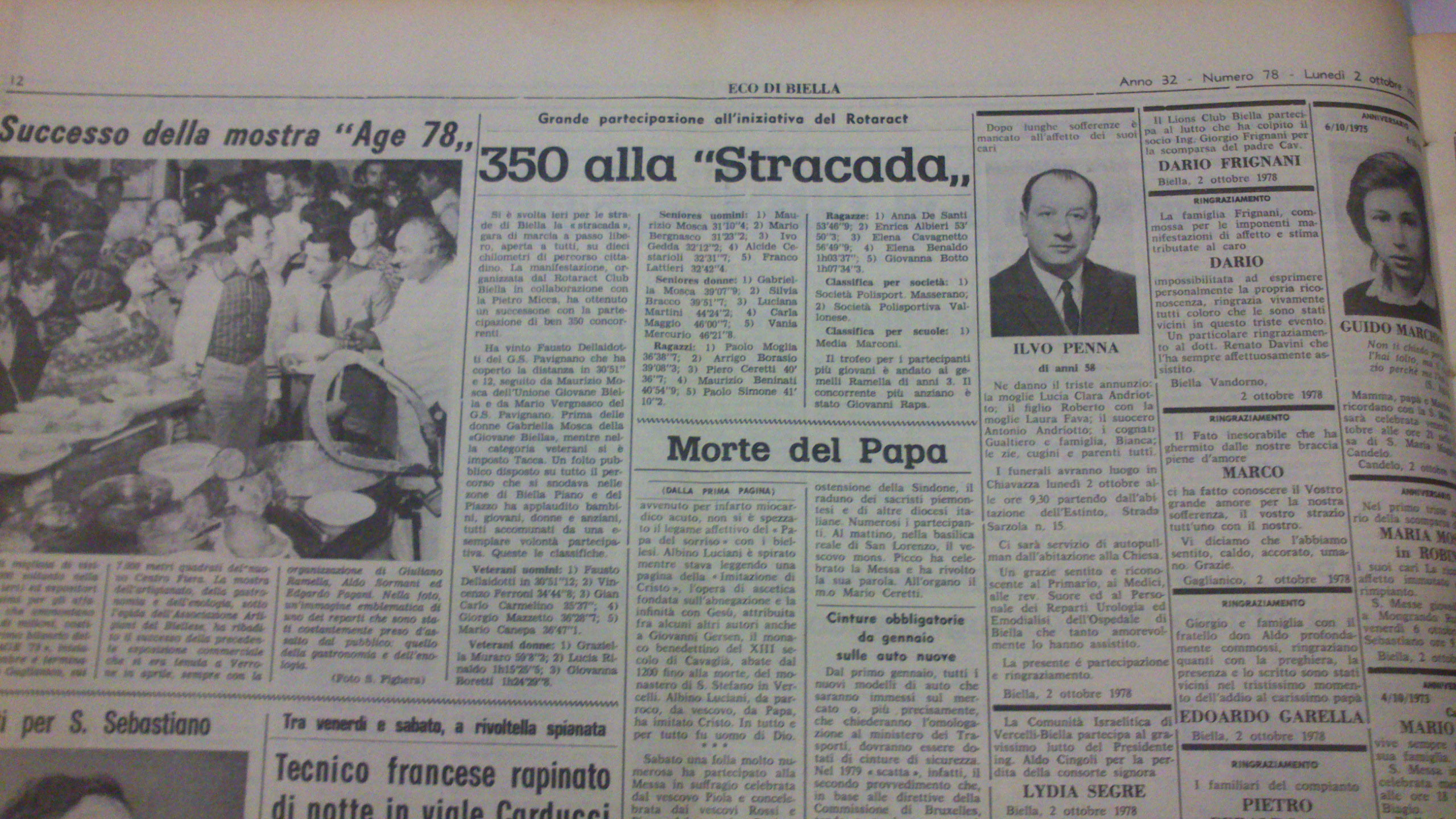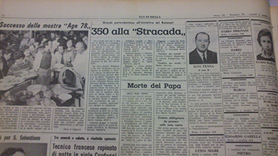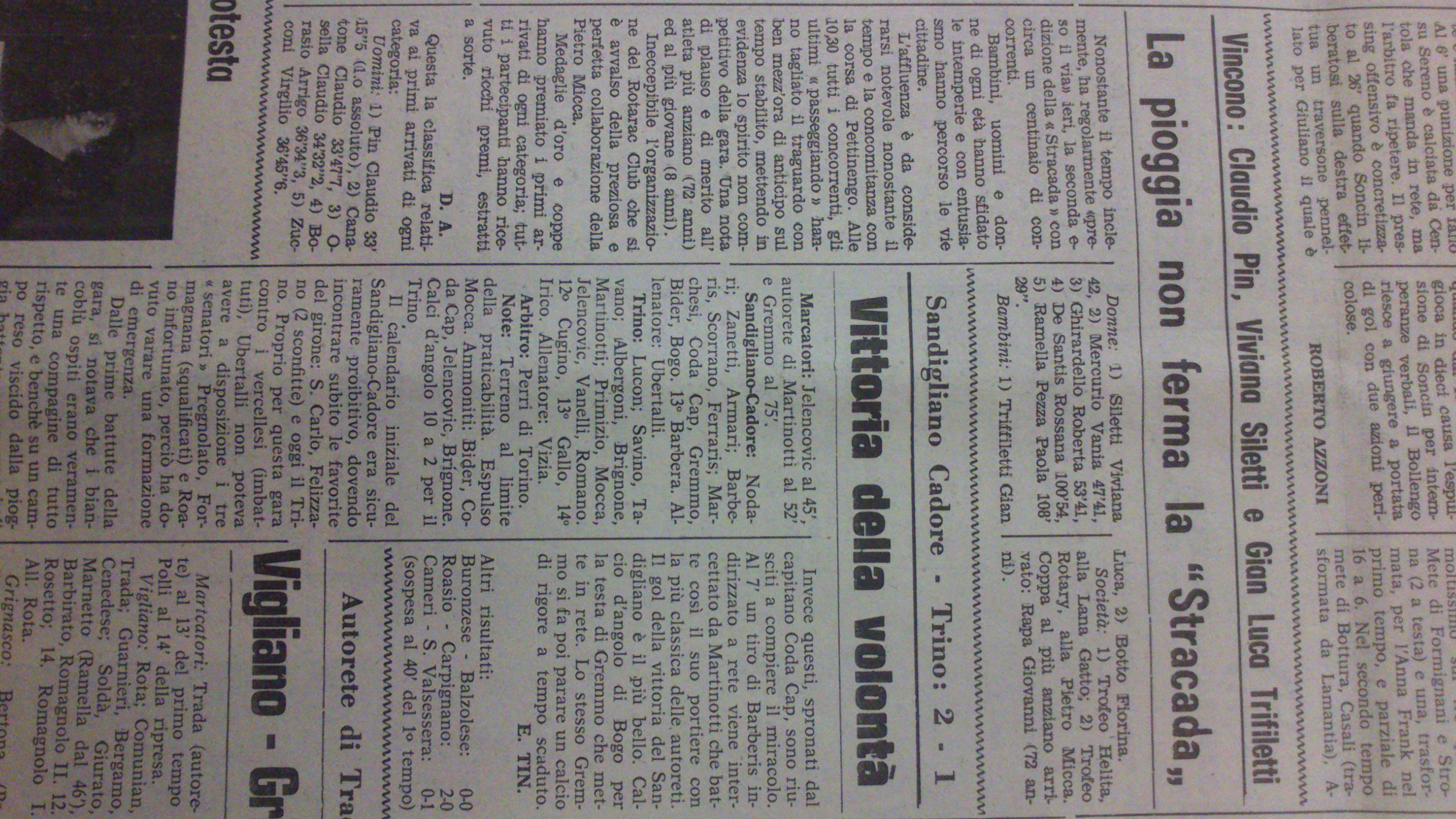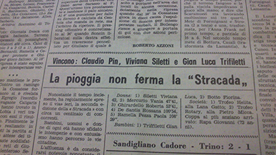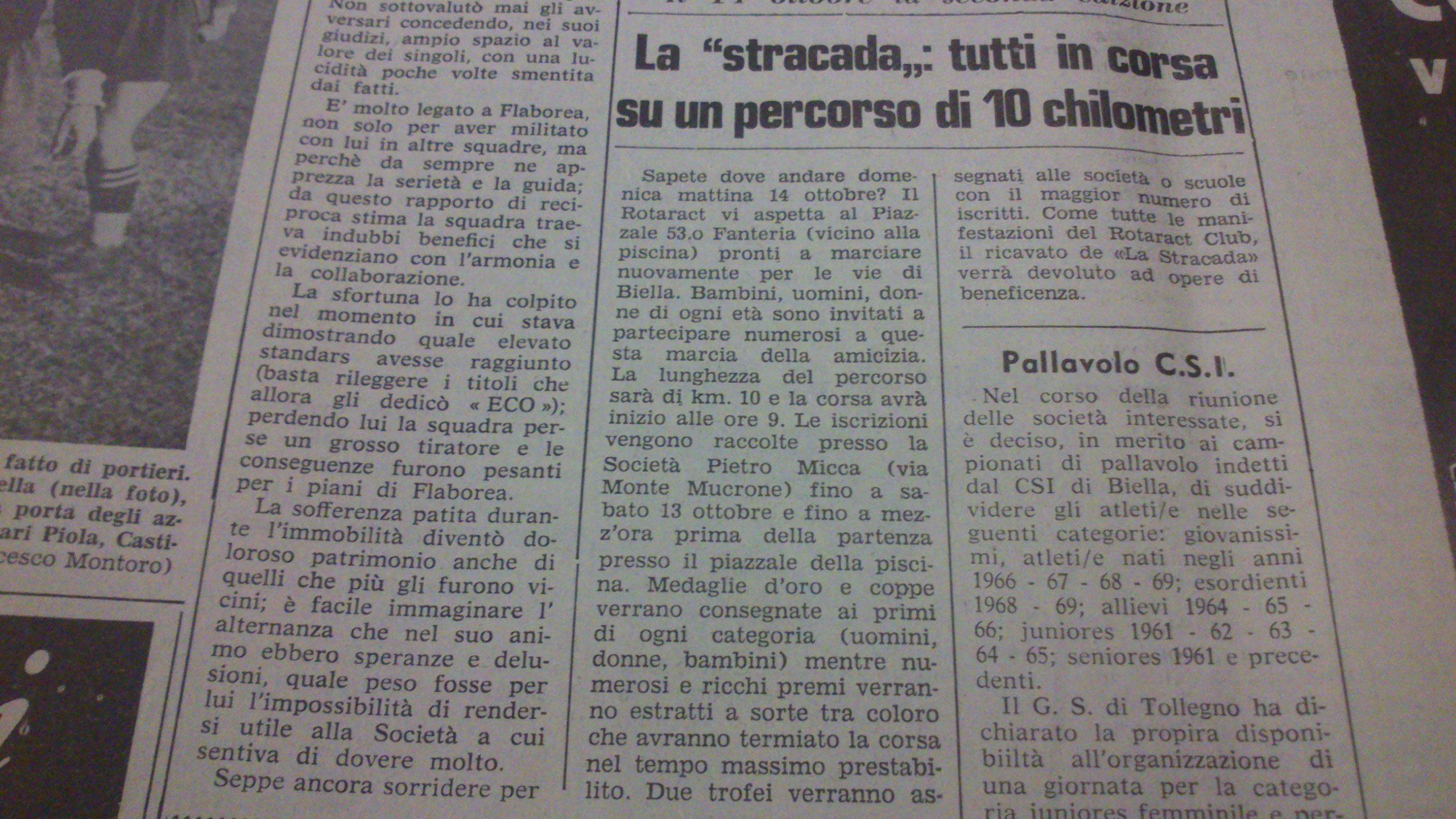 Era l'Ottobre del 1978 e sull'Eco di Biella compariva un articolo dal titolo "350 alla Stracada. Grande partecipazione all'iniziativa del Rotaract". L'articolo proseguiva con le classifiche dei veterani uomini, veterani donne, seniores uomini, seniores donne, ragazzi, ragazze e tra i vincitori una coppia di gemelli di 3 anni! Nella pagina a fianco con il titolo "Che Stracada" appariva una foto di un gruppo in piena azione durante la corsa (per le foto storiche visita la galleria) che vedeva la presenza di 350 partecipanti.